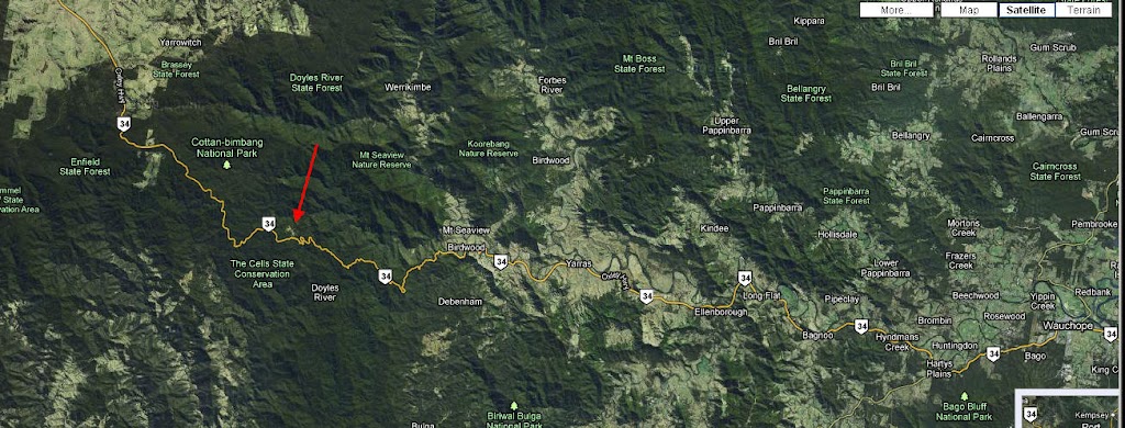 Here's a pic of the good bits of the Oxley Highway for the rest of the world.  The red arrow is pointing to where Klavdy and I stopped along the way and where he and the rest of the gang stop in the video.  Try this for a larger version:  http://picasaweb.google.com/zulu01/Misc#slideshow/5434506083504521666