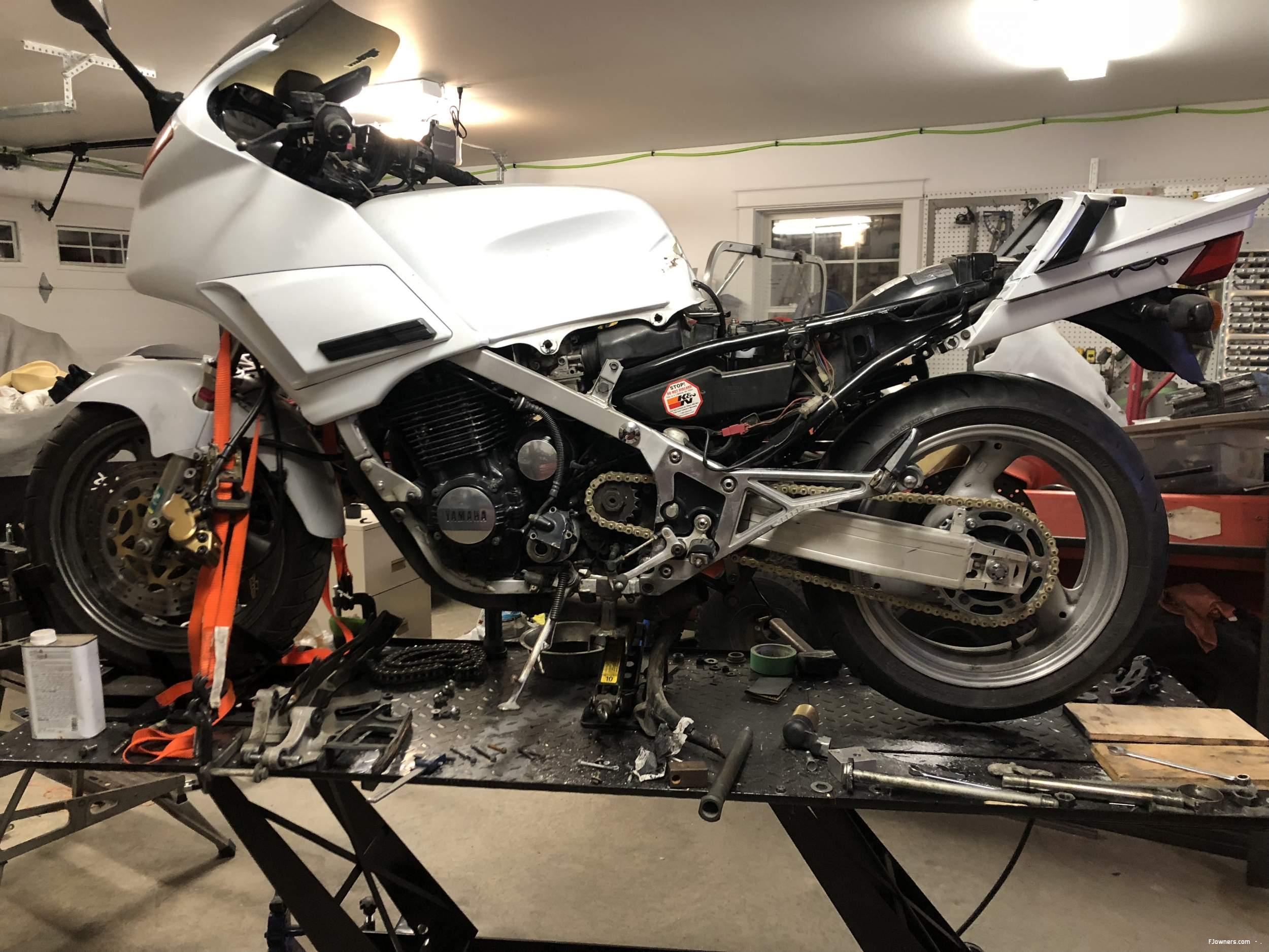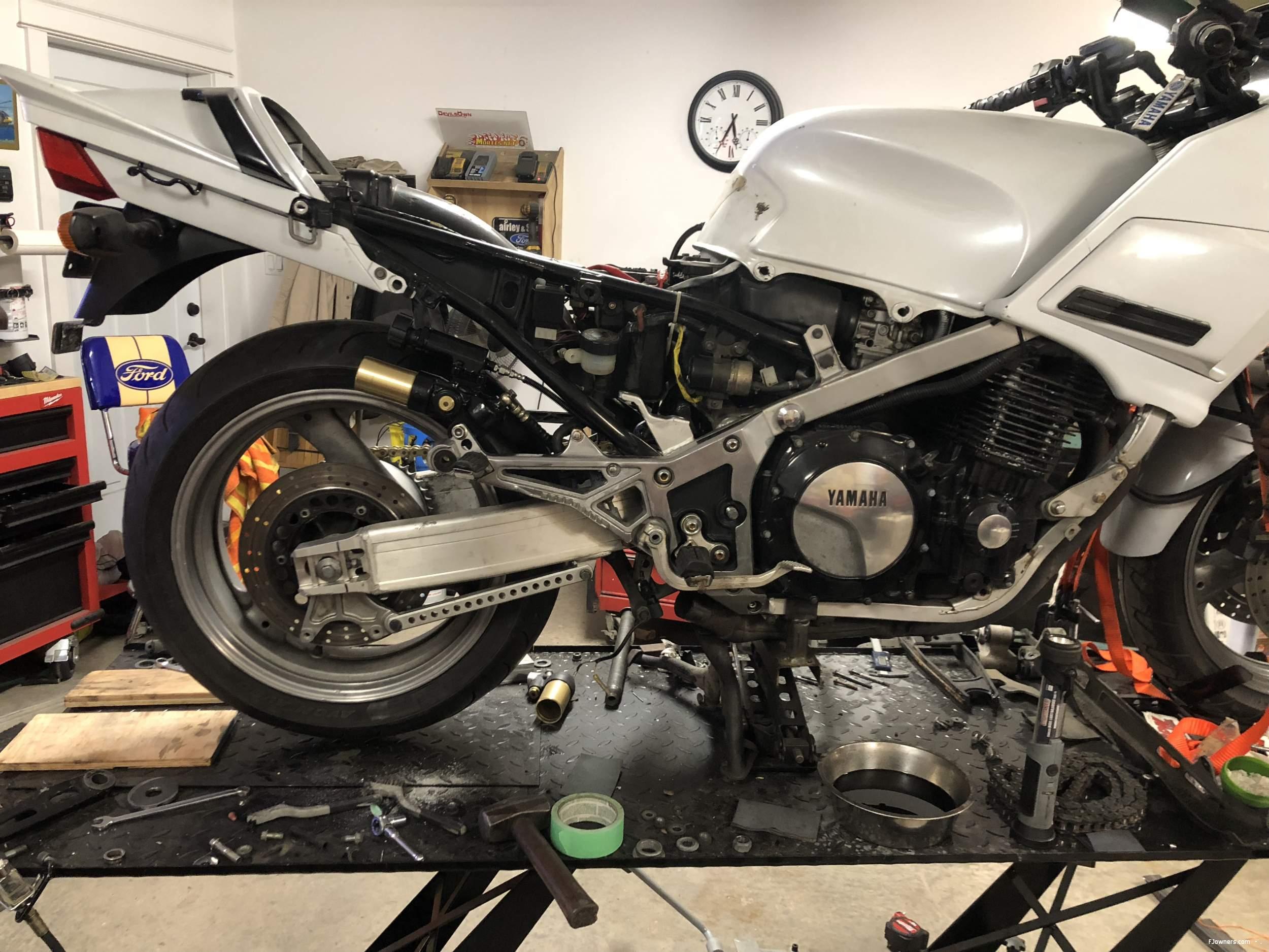 Just something else you need to consider about the FZ1 swingarm swap is the difference in location of the dog bone attachment point of the FZ1 and the FJ swingarms.  The mounting point on the FZ1 swingarm is too far rearward compared to the FJ. You can make longer dog bones and bolt it all together, but I found that the ride and handling was far less than optimal. I cut off the lug on the bottom of the FZ swingarm, had a block machined to receive the FJ needle bearings and had it welded to the front of the swingarm cross member. It restored the suspension linkage geometry to where I ended up using the original 3XW dogbones and that left me with 5/8" of clearance under the rear tire while on the center stand. I tried the unmodified FZ1 swingarm for a couple of months and never could get it to ride well at all, even with the RPM shock. If you don't like the extra length of the FZ1 swingarm,  you really would be better off to just build a brace for the FJ swingarm and call it a day.